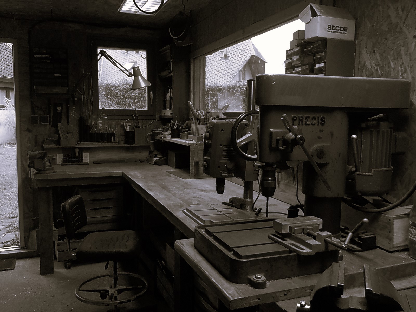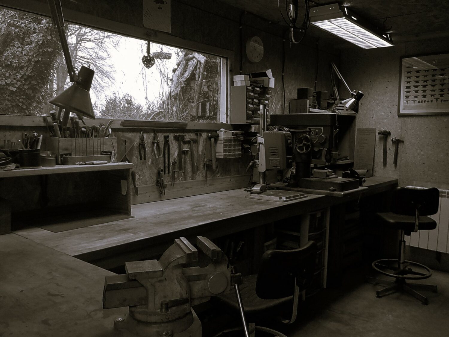Salle la plus lumineuse, avec un grand établi et principalement des outils à main pour le montage et le travail de précision.