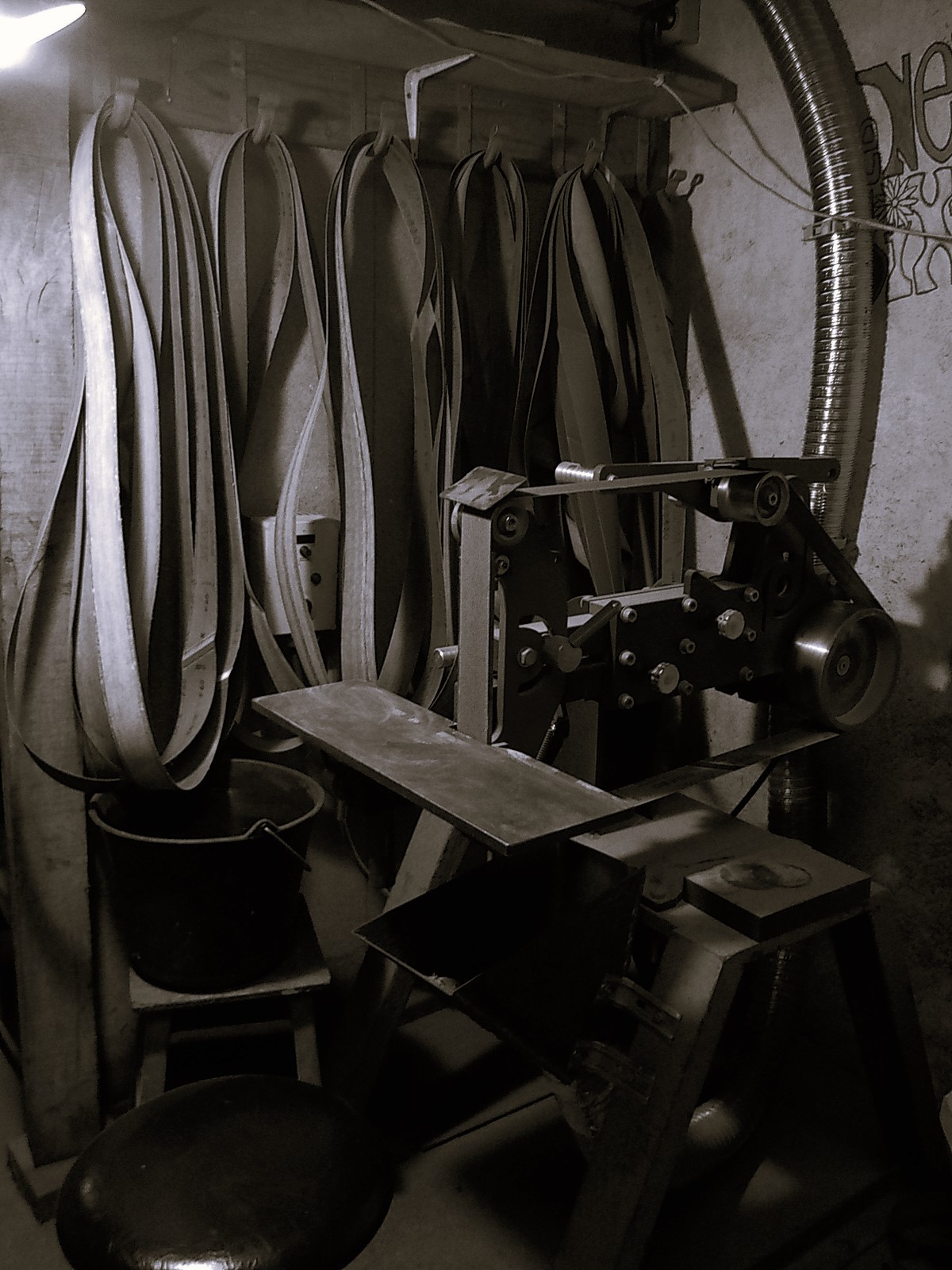 Nous y trouvons 2 backstands, ainsi qu’une grande collection de bandes abrasives, une scie à ruban, une scie à chantourner, une fraiseuse et des polissoirs.