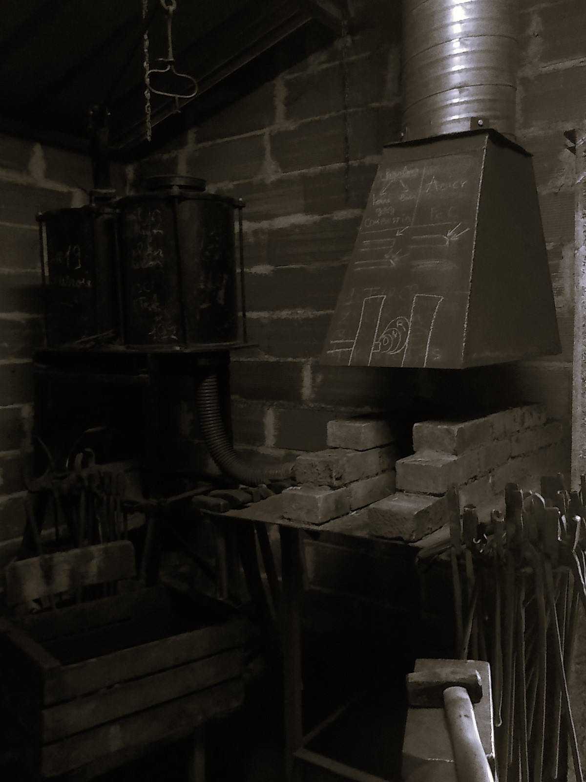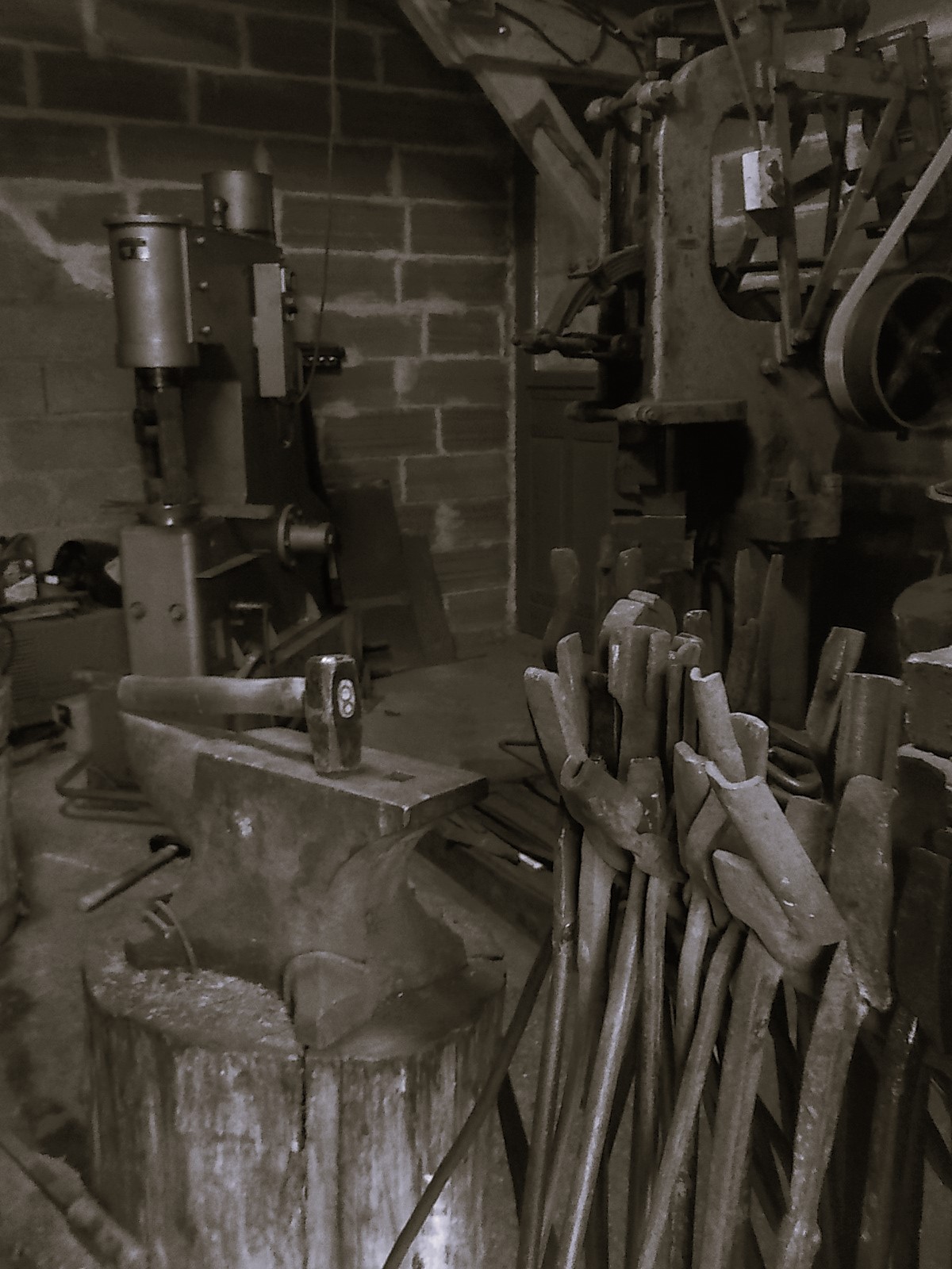 Elle est composée d’une forge traditionnelle au charbon de bois et soufflerie manuelle, d’une forge à gaz, plusieurs enclumes et 2 marteaux-pilons.